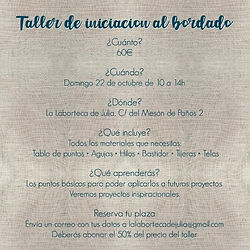 SEGUNDA PARTE DEL TALLER DE INICIACIÓN AL BORDADO ¿CUÁNTO? 60 € ¿CUÁNDO? Domingo 19 de noviembre de 10:00 a 14:00 ¿QUIÉN LO IMPARTE? Carolina Real ¿DÓNDE? En La Laborteca de Julia, Calle Mesón de Paños, 2 - Metro Ópera ¿QUÉ APRENDERÁS? En el taller aprenderemos los puntos básicos de bordado: veremos cómo utilizando diferentes tipos de hilo o soportes (tejidos, papel..) los resultados son muy diversos. Gracias a que el bordado es una técnica infinita, veremos que con muy pocos conocimientos, se abrirá ante nosotros un abanico inmenso de posibilidades para desarrollar nuestros proyectos. ¿CÓMO ESTÁ ORGANIZADO EL TALLER? Durante la mañana iremos viendo el trabajo de diversos artistas para descubrir cómo la misma técnica consigue acabados muy distintos. Este aprendizaje nos servirá de inspiración. Cada asistente realizará su propia tabla de puntos para que le sirva de guía. Según nos vayamos sintiendo más cómodos con la técnica, plantearemos un primer proyecto sencillo en el que poder aplicar lo que hemos aprendido ¿QUÉ MATERIALES INCLUYE? -Tela de algodón -Agujas -Hilos -Bastidor -Tijeras ¿CÓMO RESERVO MI PLAZA? Envíanos un correo a lalabortecadejulia@gmail.com indicando tu nombre y número de teléfono. Para la reserva es necesario abonar el 50% del precio del taller por transferencia bancaria o bizum (recuerda enviar el justificante) o pasando por La Laborteca de Julia El resto se abonará en efectivo en el día del taller.